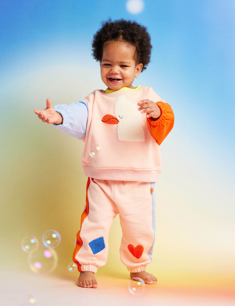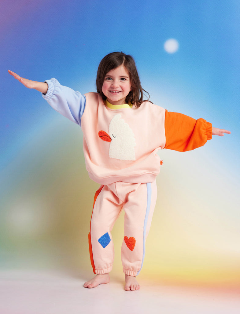 Features an oversized shape, elasticised cuffs and boucle applique.