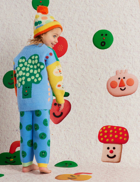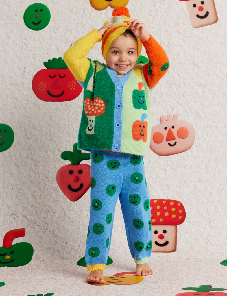Features a central button opening, subtle fluffy finish and picture knit design from our Pocket Patch collection on both sides.