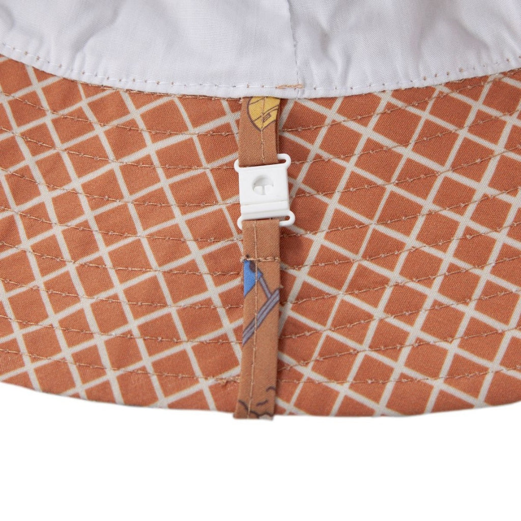 Bucket hat with a chestnut base and fun building elements like a hard hat, truck and tools on outside and a chestnut and cream check on the inner brim.