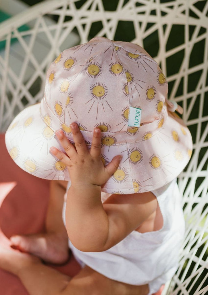 Stretch cotton sunhat with a peach based print with golden smiling suns designed by Jacinta Weir from Two Little Ducklings. Made in super soft and stretchy fabric for maximum comfort. Cord and tie around the head for the perfect fit. Cord and tie under the chin to keep the hat in place.